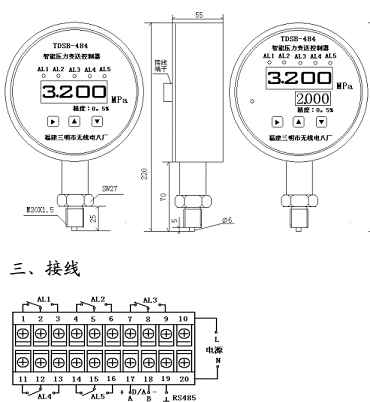 TDSB-484ZL系列壓阻式智能數顯壓力變送器、控制器是集壓力測量、顯示、控制于一體的多功能產品。該產品為全電子數字技術。結構,前端采用帶隔離膜充油芯體的壓阻式壓力傳感器,輸出信號由高精度、低溫漂和高可靠性的放大電路轉換為標準信號。它使用方便,參數在儀表盤面設定,廣泛應用于電力、自來水、水處理、石油、化工、冶金等行業(yè),對流體介質的壓力進行監(jiān)控,是指針電接點壓力表的理想替代產品。