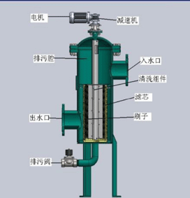 的排污閥;馬達帶動本體濾網(wǎng)內的兩把不銹鋼刷轉動,被濾網(wǎng)所